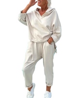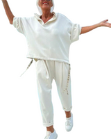 Conçu pour une détente absolue, cet ensemble comprend un haut ample et un pantalon assorti, offrant un équilibre parfait entre confort et style décontracté moderne.