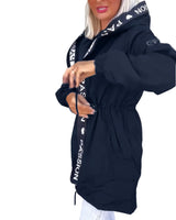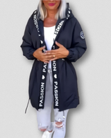 • Se distingue par son détail sophistiqué de capuche à cordon de serrage et sa coupe flatteuse.